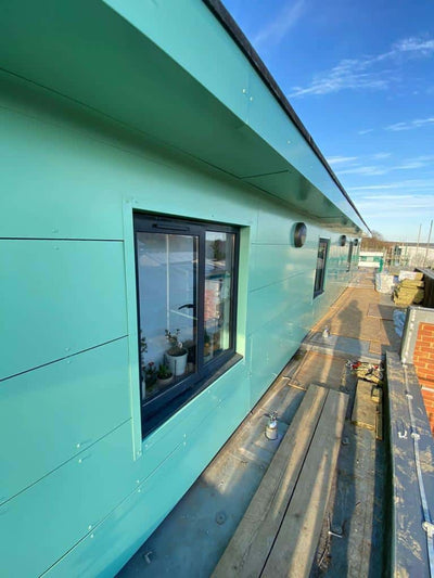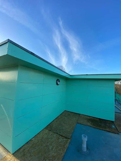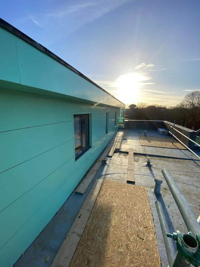 The system selected for this project was a 3mm aluminium flat face-fixed panel solution, supported by a 140mm bracket and rail system for maximum structural integrity. To enhance thermal and acoustic performance, an 80mm Rockwool Duo Slab was installed alongside Tyvek Firecurb breather membrane, covering a total façade area of 165 square metres. These materials were chosen for their strength, modern appearance, and ability to contribute to both building performance and compliance. The panels were coated in a vibrant Feather Green (RAL 160 80 20), applied using a durable polyester powder coating. This finish provided a fresh, contemporary look while offering lasting protection from the elements.